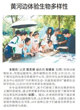 观察动植物标本,用望远镜观鸟,制作植物压花书签,8月22日,位于黄河边的仙客自然教育中心内,郑州市生态环境监测和安全中心组织的“守护黄河生态·共建美丽郑州”暑期生态研学活动,让近50名学生和家长受益匪浅。(今日《郑州日报》1版)