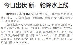 今日正式出伏,一年中最热的时段就要过去了。郑州市新一轮降雨过程将再度上线,持续5日,请注意防范。(今日《郑州日报》1版)
