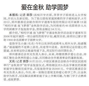 高校开学在即,莘莘学子即将进入大学校园,开启人生新征程。为了助力那些家庭困难的学子顺利就学,8月23日,郑州慈善总会联合郑州宇通客车股份有限公司开展第19届“相约宇通 放飞梦想”金秋助学活动,为河南省内45名即将步入大学的困难学子发放助学金,资助金额近34万元。(今日《郑州日报》2版)