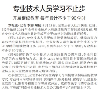 8月23日,记者从省人社厅获悉,近日,《关于做好2024年全省专业技术人员继续教育工作的通知》发布,规定专业技术人员每年累计完成不少于90学时的继续教育任务。(今日《郑州日报》2版)