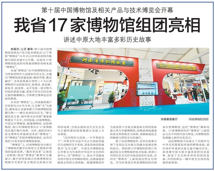 第十届中国博物馆及相关产品与技术博览会(以下简称“博博会”)8月23日在呼和浩特市敕勒川国际会展中心开幕。由省内17家博物馆组成的河南展团精彩亮相本届“博博会”。(今日《郑州日报》4版)