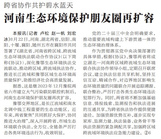 8月22日,河南、湖北两省,信阳、南阳、十堰、襄阳、随州五市在襄阳市共同签署了《湖北省、河南省跨区域、跨流域生态环境执法联动合作协议》(以下简称《协议》),深化豫鄂生态环境执法交流联动,推动跨区域、跨流域执法协作,推进长江流域和豫鄂区域生态环境高质量保护,助推经济社会高质量发展。(今日《河南日报》1版)