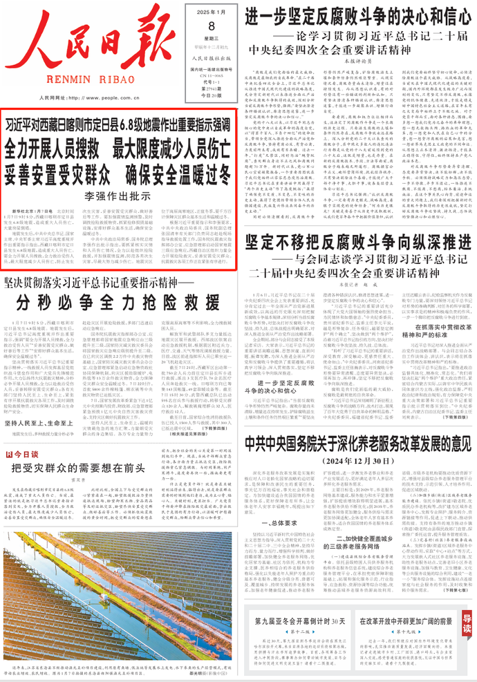 1月7日9时5分,西藏日喀则市定日县发生6.8级地震。地震发生后,习近平总书记高度重视并作出重要指示,强调“要全力开展人员搜救,全力救治受伤人员”“妥善安置受灾群众,做好善后等工作”“安排好群众基本生活,确保安全温暖过冬”。(今日《人民日报》1版、4版)