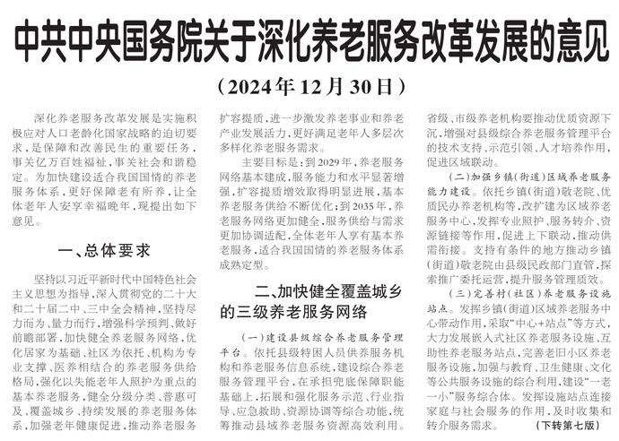 深化养老服务改革发展是实施积极应对人口老龄化国家战略的迫切要求,是保障和改善民生的重要任务,事关亿万百姓福祉,事关社会和谐稳定。为加快建设适合我国国情的养老服务体系,更好保障老有所养,让全体老年人安享幸福晚年,现提出如下意见。(今日《人民日报》1版、7版)