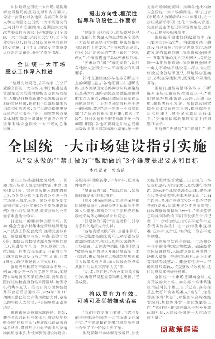 加快建设全国统一大市场,是构建新发展格局的基础支撑和内在要求。为进一步强化对各地区、各部门加快融入和主动服务全国统一大市场建设的正向引导和负面约束,近期国家发展改革委会同有关部门研究制定了《全国统一大市场建设指引(试行)》(以下简称《指引》),目前已报经国务院同意并印发实施。1月7日,国家发展改革委举行新闻发布会,介绍了有关情况。(今日《人民日报》2版)