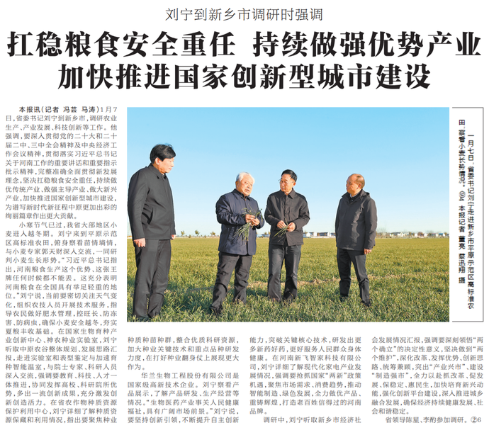 1月7日,省委书记刘宁到新乡市,调研农业生产、产业发展、科技创新等工作。他强调,要深入贯彻党的二十大和二十届二中、三中全会精神及中央经济工作会议精神,贯彻落实习近平总书记关于河南工作的重要讲话和重要指示批示精神,完整准确全面贯彻新发展理念,坚决扛稳粮食安全重任,持续做优传统产业、做强主导产业、做大新兴产业,加快推进国家创新型城市建设,为谱写新时代新征程中原更加出彩的绚丽篇章作出更大贡献。(今日《河南日报》1版)