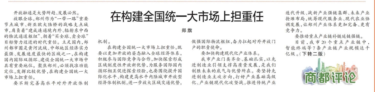 放眼全球,郑州作为“一带一路”重要节点城市、新亚欧大陆桥的战略支点城市,肩负着“建成连通境内外、辐射东中西的物流通道枢纽”、朝着“买全球、卖全球”目标努力迈进的时代重任。立足国内,郑州都市圈是黄河流域、中部地区经济实力最强、发展速度最快的区域之一,在构建国内国际双循环、建设全国统一大市场中具有重要地位。聚焦郑州,必须找准功能定位,发挥比较优势,在构建全国统一大市场上担重任。(今日《郑州日报》1版)