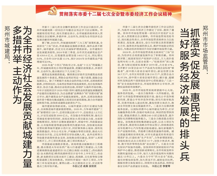 市委十二届七次全会暨市委经济工作会议的召开,为我市 2025 年经济工作锚定了目标、提供了遵循。郑州市市场监管局第一时间召开党组扩大会议,深入贯彻落实会议精神。市市场监管局党组书记、局长姚志伟表示,全市市场监管系统将全力以赴抓落实、促发展、惠民生,奋力当好落实改革部署的主力军、服务经济发展的排头兵、维护市场稳定的压舱石,为推动经济持续回升向好贡献市场监管力量。(今日《郑州日报》2版)