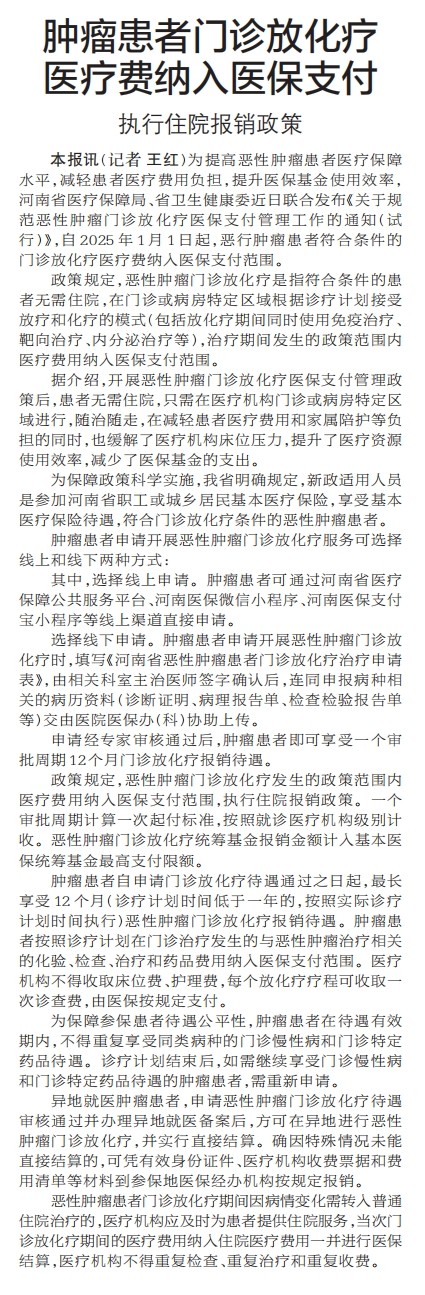 为提高恶性肿瘤患者医疗保障水平,减轻患者医疗费用负担,提升医保基金使用效率,河南省医疗保障局、省卫生健康委近日联合发布《关于规范恶性肿瘤门诊放化疗医保支付管理工作的通知(试行)》,自2025年1月1日起,恶行肿瘤患者符合条件的门诊放化疗医疗费纳入医保支付范围。(今日《郑州日报》2版)
