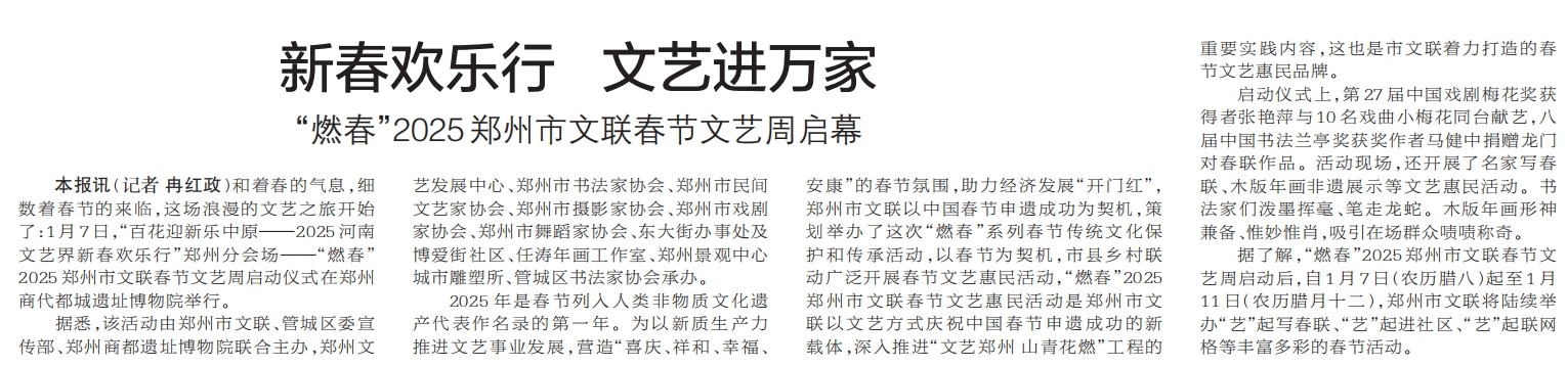 和着春的气息,细数着春节的来临,这场浪漫的文艺之旅开始了:1月7日,“百花迎新乐中原——2025 河南文艺界新春欢乐行”郑州分会场——“燃春”2025 郑州市文联春节文艺周启动仪式在郑州商代都城遗址博物院举行。(今日《郑州日报》2版)
