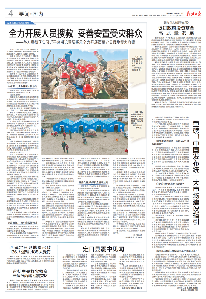 中共中央政治局常委、国务院总理李强作出批示指出,要抓紧核实灾情和人员伤亡情况,全力以赴组织抢险救援,并加强震情监测,防范各类次生灾害,尽最大努力减少伤亡。地震灾区位于高原高寒地区,正值冬季,要千方百计保障灾区群众基本生活和温暖过冬。(今日《人民日报》1版)