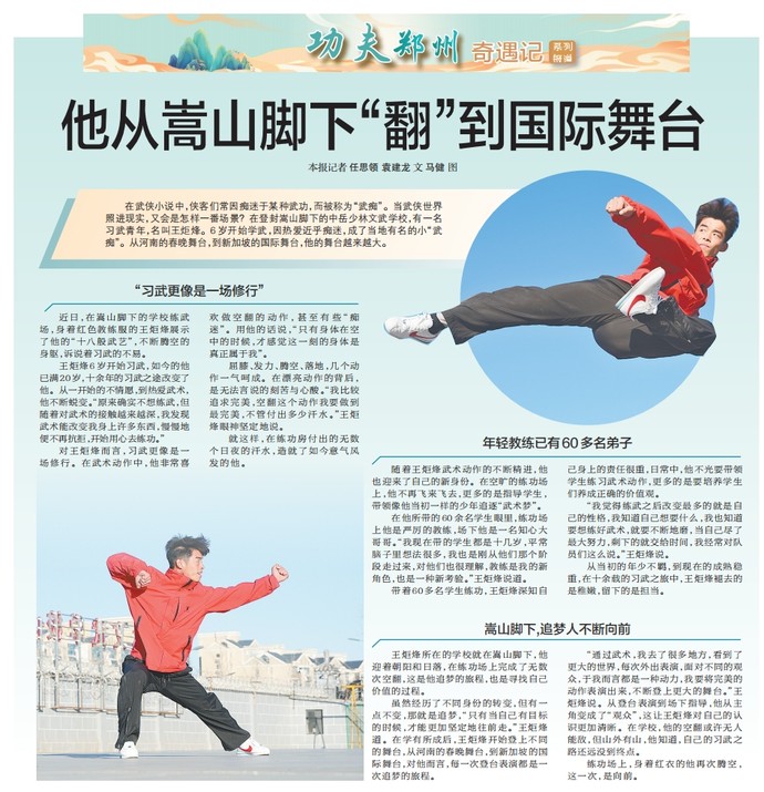 在武侠小说中,侠客们常因痴迷于某种武功,而被称为“武痴”。当武侠世界照进现实,又会是怎样一番场景?在登封嵩山脚下的中岳少林文武学校,有一名习武青年,名叫王炬烽。6岁开始学武,因热爱近乎痴迷,成了当地有名的小“武痴”。从河南的春晚舞台,到新加坡的国际舞台,他的舞台越来越大。(今日《郑州日报》5版)