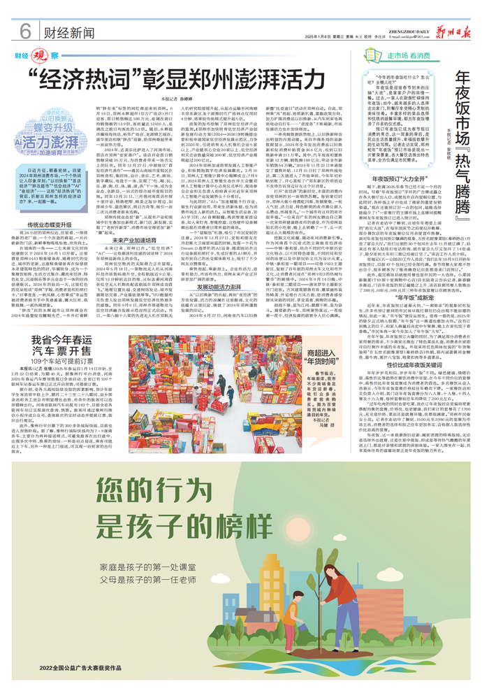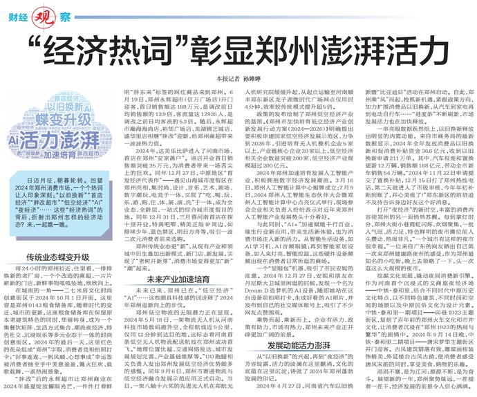 日迈月征,朝暮轮转。回望2024年郑州消费市场,一个个热词让人印象深刻:“以旧换新”“首店经济”“胖改超市”“低空经济”“AI”“夜经济”…… 这些“经济热词”的背后,折射出郑州怎样的经济动态?来,一起瞧一瞧。(今日《郑州日报》6版)