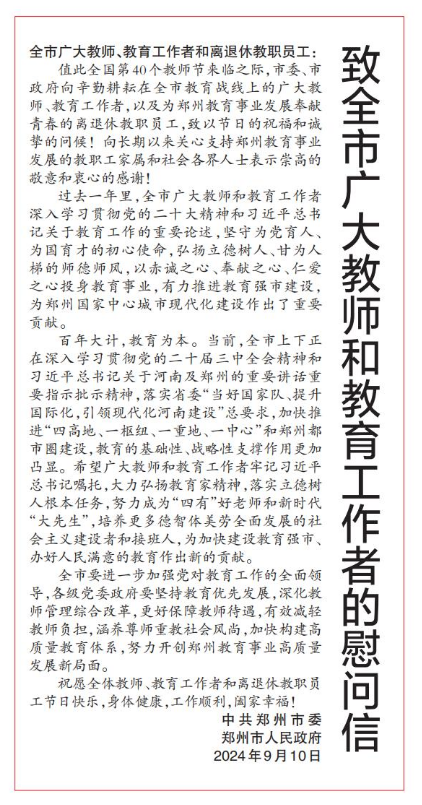 值此全国第40个教师节来临之际,市委、市政府向辛勤耕耘在全市教育战线上的广大教师、教育工作者,以及为郑州教育事业发展奉献青春的离退休教职员工,致以节日的祝福和诚挚的问候!向长期以来关心支持郑州教育事业发展的教职工家属和社会各界人士表示崇高的敬意和衷心的感谢!(今日《郑州日报》1版)