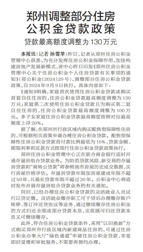 昨日,记者从郑州住房公积金管理中心获悉,为充分发挥住房公积金保障作用,加快构建房地产发展新模式,该中心昨日印发《郑州住房公积金管理中心关于住房公积金个人住房贷款有关事项的通知》(郑公积金〔2024〕29号),调整部分住房公积金贷款政策,自2024年9月9日执行。(今日《郑州日报》1版)