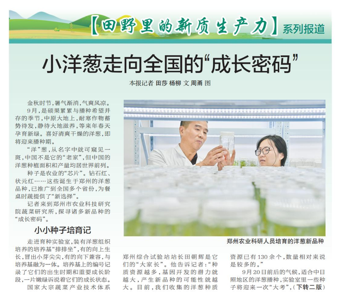 种子是农业的“芯片”。钻石红、状元红……这些诞生于郑州的洋葱品种,已推广到全国多个省份,为餐桌时蔬提供了“新选择”。(今日《郑州日报》1版、2版)