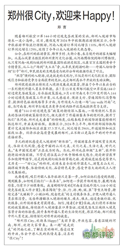 随着郑州航空口岸144小时过境免签政策的实施,郑州入境游市场迎来一波小高峰。近日,携程发布2024年中秋假期旅游预测显示,今年中秋旅游市场流行拼假游,河南入境游订单同比增长110%,郑州入境游订单同比增长129%,延续了今年以来入境游的火热态势。(今日《郑州日报》2版)