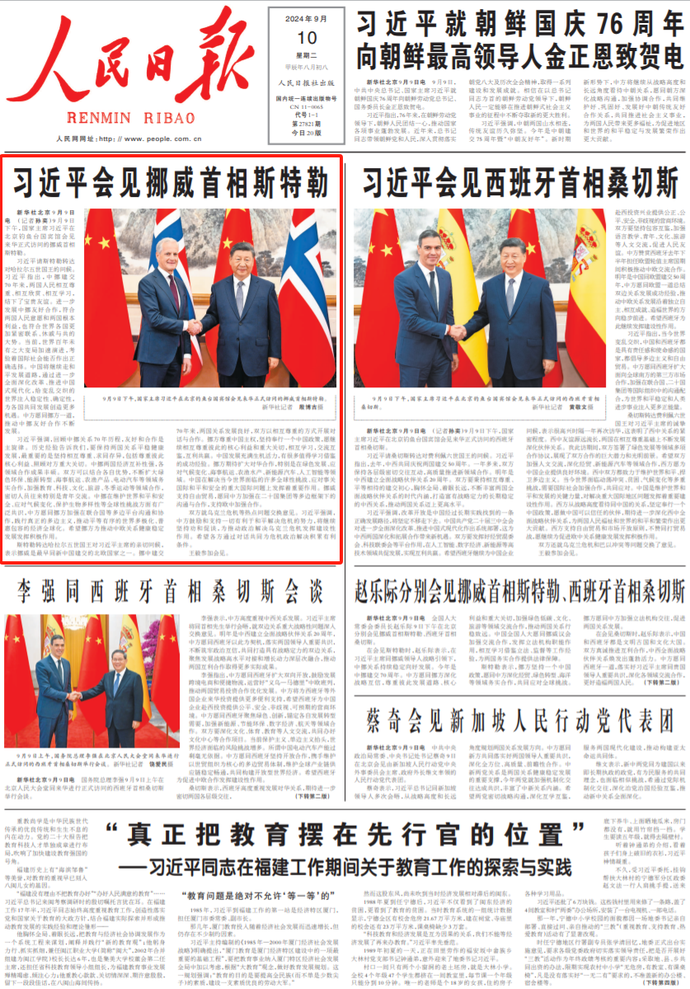 9月9日,中共中央总书记、国家主席习近平就朝鲜国庆76周年向朝鲜劳动党总书记、国务委员长金正恩致贺电。(今日《人民日报》1版)