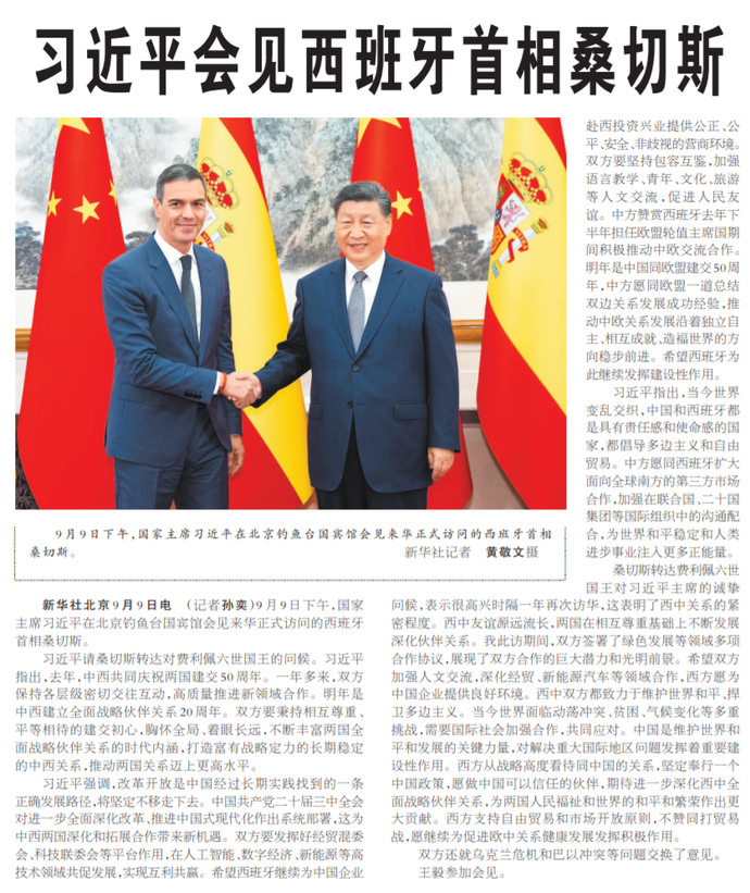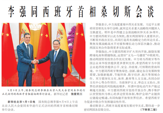 国务院总理李强9月9日上午在北京人民大会堂同来华进行正式访问的西班牙首相桑切斯举行会谈。(今日《人民日报》1版、2版)