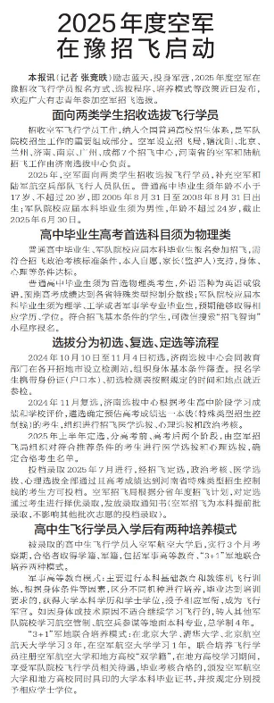 励志蓝天,投身军营,2025年度空军在豫招收飞行学员报名方式、选拔程序、培养模式等政策近日发布,欢迎广大有志青年参加空军招飞选拔。(今日《郑州日报》6版)
