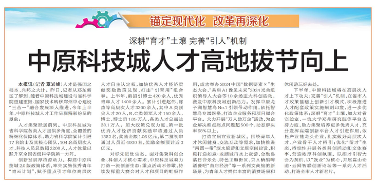 人才是强国之根本、兴邦之大计。昨日,记者从郑东新区了解到,随着中原科技城建设与省科学院重建重振、国家技术转移郑州中心建设“三合一”融合发展深入推进,今年上半年,中原科技城人才工作呈现精彩纷呈的景象:(今日《郑州日报》7版)