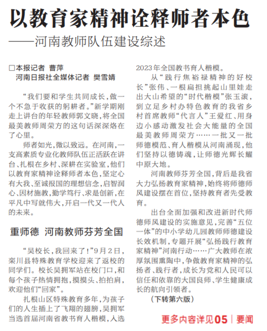 “我们要和学生共同成长,做一个不急于收获的躬耕者。”新学期刚走上讲台的年轻教师郭文晓,将全国最美教师周荣方的这句话深深烙在了心里。(今日《河南日报》1版、6版)