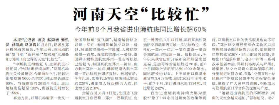 9月8日,记者从郑州机场海关获悉,今年以来,进出境航班“复飞潮”“新开潮”“加密潮”三潮叠加,河南飞向世界的天空“比较忙”。(今日《河南日报》2版)
