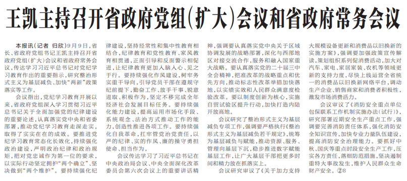 9月9日,省长、省政府党组书记王凯主持召开省政府党组(扩大)会议和省政府常务会议,传达学习习近平总书记对党纪学习教育作出的重要指示,研究整治形式主义为基层减负、加快“两新”政策落实等工作。(今日《河南日报》1版)
