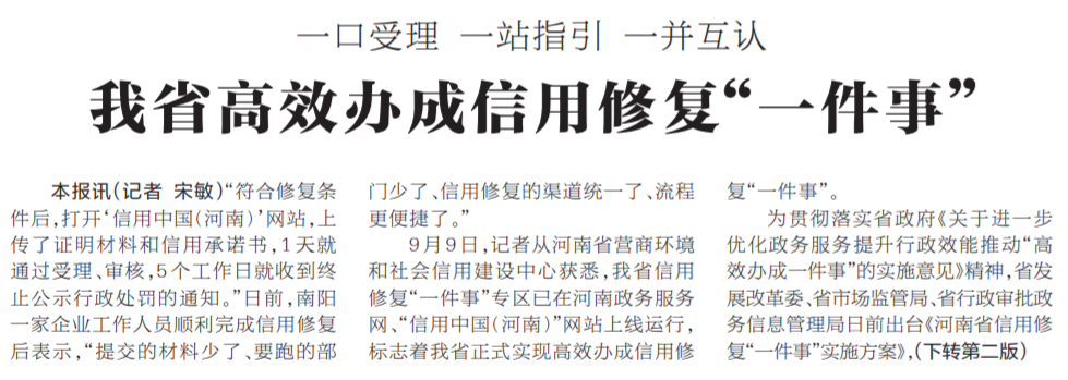 “符合修复条件后,打开‘信用中国(河南)’网站,上传了证明材料和信用承诺书,1天就通过受理、审核,5个工作日就收到终止公示行政处罚的通知。”日前,南阳一家企业工作人员顺利完成信用修复后表示,“提交的材料少了、要跑的部门少了、信用修复的渠道统一了、流程更便捷了。”(今日《河南日报》1版、2版)