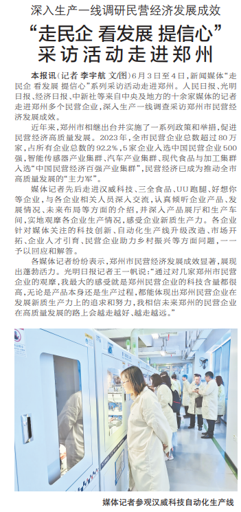 6月3日至4日,新闻媒体“走民企 看发展 提信心”系列采访活动走进郑州。人民日报、光明日报、经济日报、中新社等来自中央及地方的十余家媒体的记者走进郑州多个民营企业,深入生产一线调查采访郑州市民营经济发展成效。(今日《郑州日报》1版)