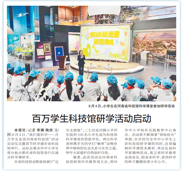 6月4日,“我们爱科学——百万学生走进河南省科技馆”活动启动仪式暨首节科学课在省科技馆举行。这标志着全市中小学生将分批分期在省科技馆进行沉浸式科学课研学。(今日《郑州日报》1版)