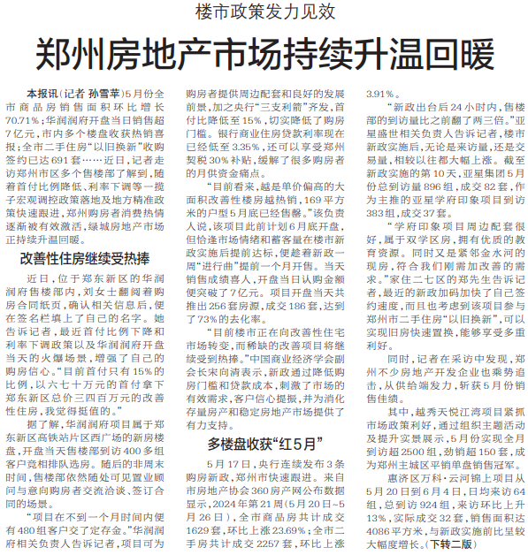 5月份全市商品房销售面积环比增长70.71%;华润润府开盘当日销售超7亿元,市内多个楼盘收获热销喜报;全市二手住房“以旧换新”收购签约已达691套……近日,记者走访郑州市区多个售楼部了解到,随着首付比例降低、利率下调等一揽子宏观调控政策落地及地方精准政策快速跟进,郑州购房者消费热情逐渐被有效激活,绿城房地产市场正持续升温回暖。(今日《郑州日报》1版、2版)