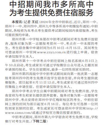 2024年全市中招临近,近日,郑州一中、郑州十一中、郑州四中、郑州九中等多所高中相继发布通知:中招期间,各校将为本考点考生提供考试期间校园内食宿服务,考生可提前预约申请。(今日《郑州日报》1版、2版)