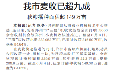 记者昨日从市农业机械技术中心获悉,连日来,随着郑州市“三夏”机收攻坚战全面打响,5000余台收割机会战郑州,小麦机收快速推进。截至6月4日,“三夏”应收获小麦228.053万亩,已累计收获215.59万亩,收获率94.54%。(今日《郑州日报》1版)