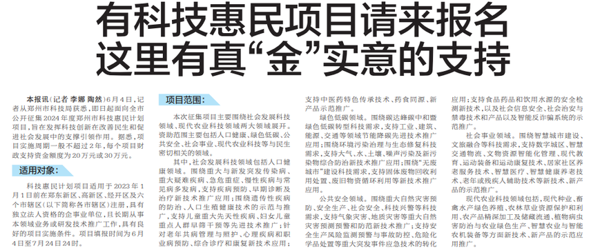 6月4日,记者从郑州市科技局获悉,即日起面向全市公开征集2024年度郑州市科技惠民计划项目,旨在发挥科技创新在改善民生和促进社会发展中的支撑引领作用。据悉,项目实施周期一般不超过2年,每个项目财政支持资金额度为20万元或30万元。(今日《郑州日报》2版)