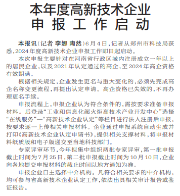 6月4日,记者从郑州市科技局获悉,2024年度高新技术企业申报工作即日起启动。(今日《郑州日报》2版)
