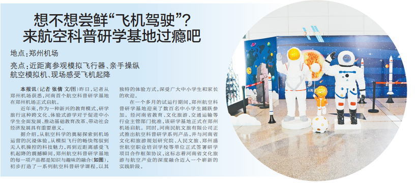 昨日,记者从郑州机场获悉,河南首个航空科普研学基地在郑州机场正式启航。(今日《郑州日报》2版)