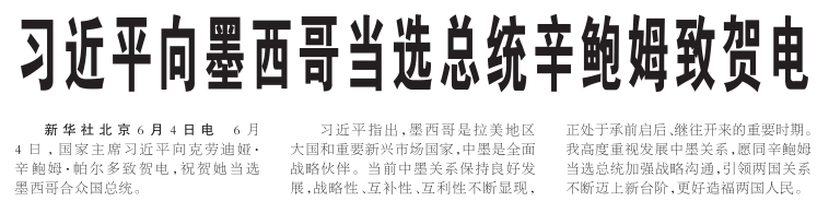 6月4日,国家主席习近平向克劳迪娅·辛鲍姆·帕尔多致贺电,祝贺她当选墨西哥合众国总统。
