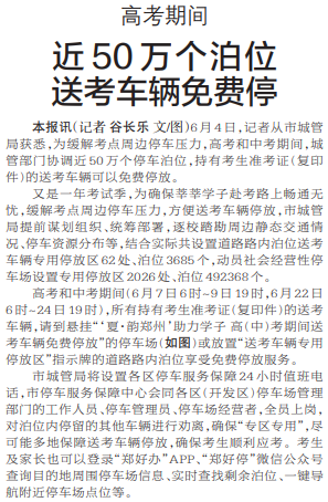 6月4日,记者从市城管局获悉,为缓解考点周边停车压力,高考和中考期间,城管部门协调近50万个停车泊位,持有考生准考证(复印件)的送考车辆可以免费停放。(今日《郑州日报》5版)