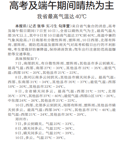 来自省气象台的消息,高考及端午假日期间(7日至10日),全省以晴热天气为主,最高气温大部35℃以上,其中9日至10日最高气温达37℃到40℃,高温中暑的气象风险高;7日南部有分散性阵雨、雷阵雨,10日西部、北部有阵雨、雷阵雨。需防范高温及雷阵雨天气对高考和假日出行的不利影响,考生要做好防暑降温,保持清淡饮食;驾车出行注意防范高温爆胎等交通事故。(今日《郑州日报》5版)