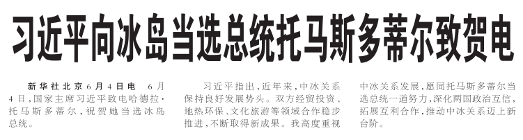 6月4日,国家主席习近平致电哈德拉·托马斯多蒂尔,祝贺她当选冰岛总统。