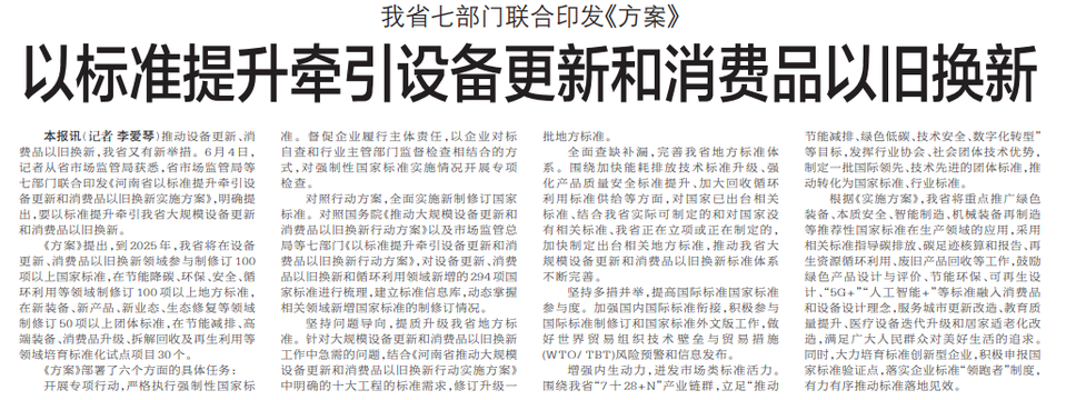 推动设备更新、消费品以旧换新,我省又有新举措。6月4日,记者从省市场监管局获悉,省市场监管局等七部门联合印发《河南省以标准提升牵引设备更新和消费品以旧换新实施方案》,明确提出,要以标准提升牵引我省大规模设备更新和消费品以旧换新。(今日《郑州日报》6版)