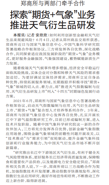 如何利用创新型金融和天气衍生品来规避风险?6月4日,记者从郑州商品交易所获悉,郑商所近日与国家气象信息中心、中国气象科学研究院签署战略合作框架协议,三方将发挥各自优势,深化战略合作,共同探索适应我国发展阶段的“期货+气象”业务模式,更好服务金融强国、气象强国建设,蓄势赋能新质生产力发展。(今日《郑州日报》6版)