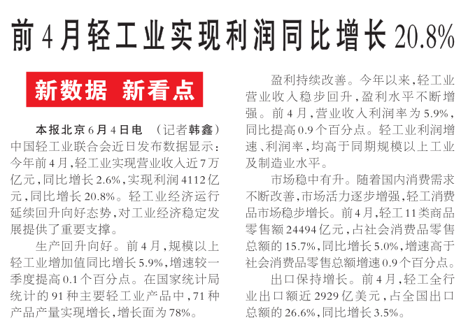 中国轻工业联合会近日发布数据显示:今年前4月,轻工业实现营业收入近7万亿元,同比增长2.6%,实现利润4112亿元,同比增长20.8%。轻工业经济运行延续回升向好态势,对工业经济稳定发展提供了重要支撑。(今日《人民日报》1版)