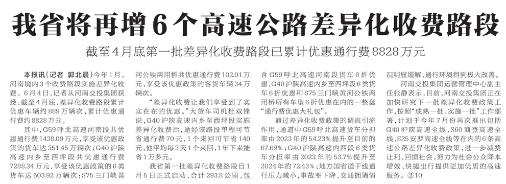 截至4月底第一批差异化收费路段已累计优惠通行费8828万元