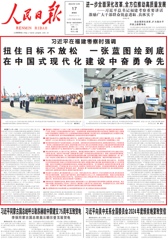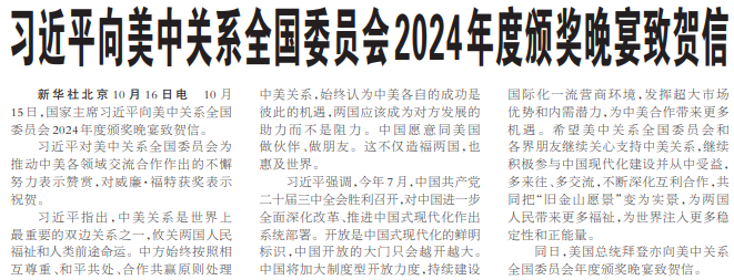 10月15日,国家主席习近平向美中关系全国委员会2024年度颁奖晚宴致贺信。(今日《人民日报》1版)