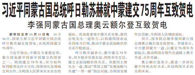 10月16日,国家主席习近平同蒙古国总统呼日勒苏赫互致贺电,庆祝两国建交75周年。(今日《人民日报》1版)