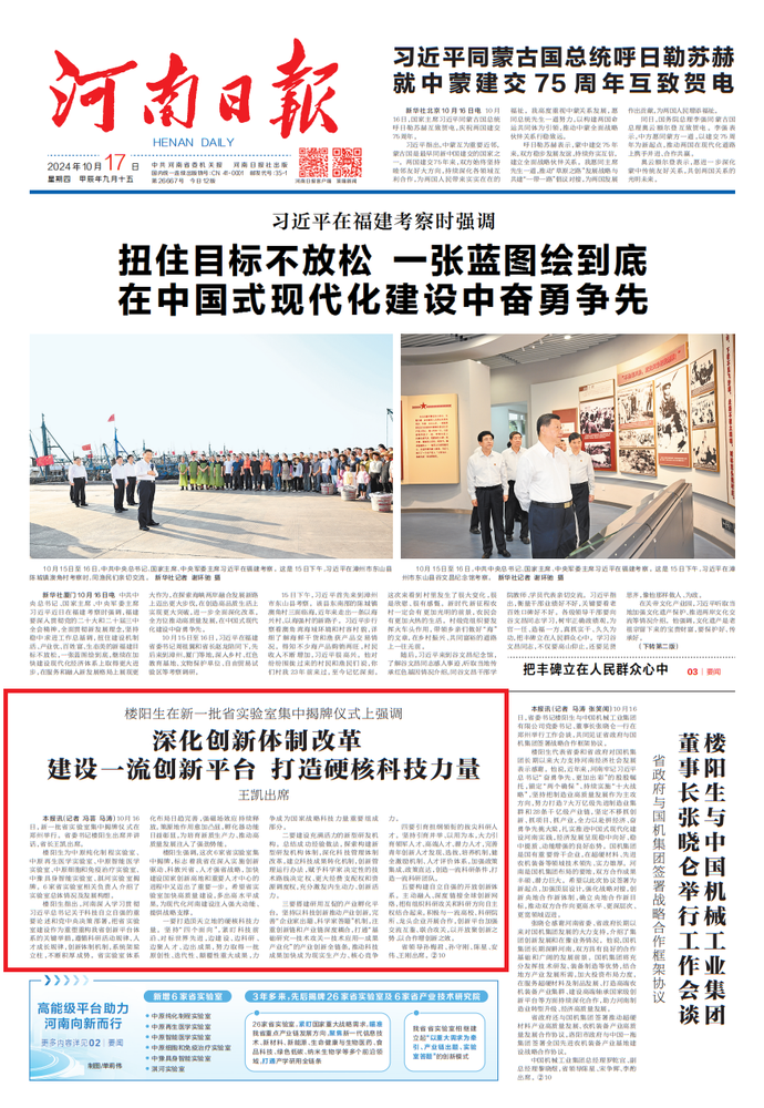 10月16日,新一批省实验室集中揭牌仪式在郑州举行。省委书记楼阳生出席并讲话,省长王凯出席。