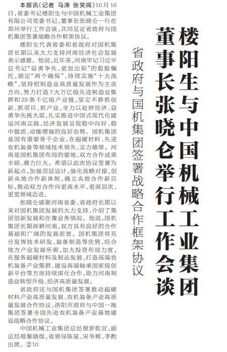 10月16日,省委书记楼阳生与中国机械工业集团有限公司党委书记、董事长张晓仑一行在郑州举行工作会谈,共同见证省政府与国机集团签署战略合作框架协议。(今日《河南日报》1版)