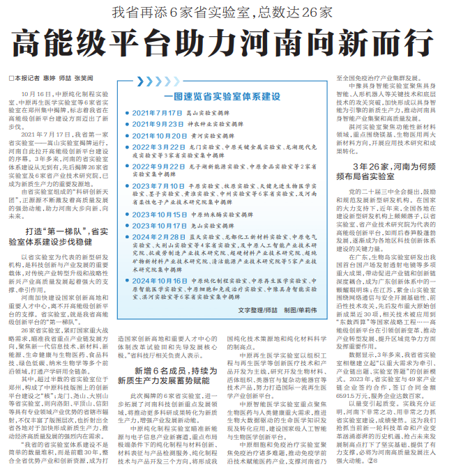 2021年7月17日,我省第一家省实验室——嵩山实验室揭牌运行,河南自此拉开高能级创新平台建设的序幕。3年多来,河南的省实验室体系建设从无到有,先后揭牌26家省实验室及6家省产业技术研究院,已成为新质生产力的重要发源地。